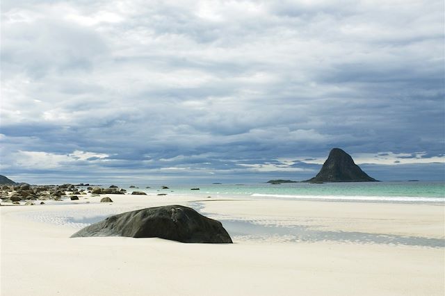 Au nord du cercle polaire, les îles des Lofoten proposent une diversité de paysages impressionnante : des montagnes enneigées plongeant dans la mer aux eaux turquoise et aux plages de sable blanc, sous le spectacle des aurores boréales.