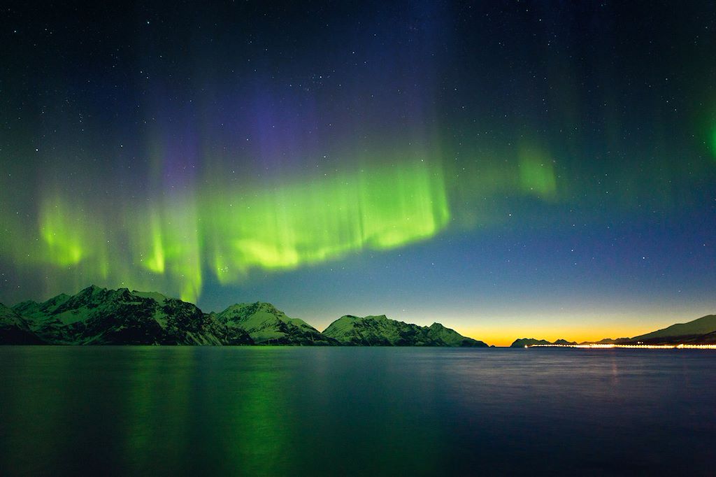 Vol vers Evenes, porte d'entrée des Îles Lofoten. Nous arrivons au Nord du Cercle Polaire. A cette période de l'année, la nuit polaire s'est installée, accompagnée des lumières du Nord : les Aurores Boréales.