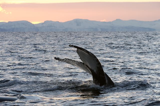 Nous  embarquons pour une sortie en mer d'observation des baleines (4h env.). Nous naviguons dans un décor spectaculaire avec en toile de fond l'île de Senja à la recherche des cétacés et autres mammifères marins comme les dauphins ou les globicéphales.
