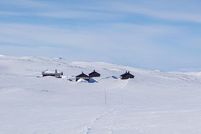 Pour cette dernière journée de ski, nous partons pour une boucle jusqu'à l'abri de Klemsbu sur les hauteurs de Finse. Nous profitons de l'abri pour déjeuner avant de revenir à la réalité et organiser le retour à Oslo du lendemain.