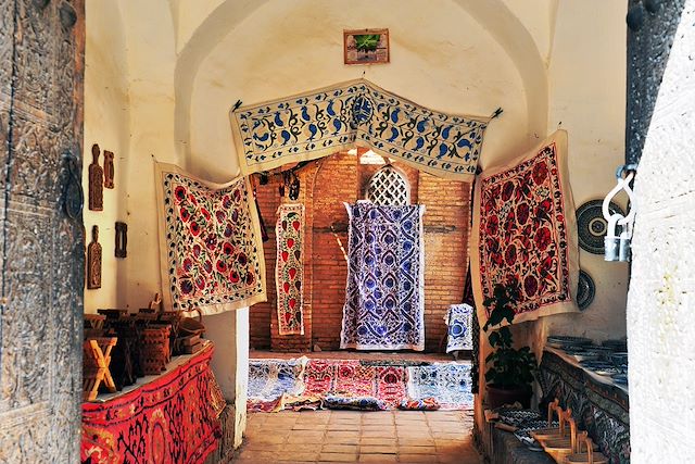 Journée de visite des principaux sites de Boukhara : la madrasa d’Oulougbeg construite par le petit-fils de Tamerlan, Oulougbeg en 1417 ; la madrasa Abdul Aziz Khan (17ème siècle), exemple de renouvellement à l’iconographie islamique : vases, fleurs, oiseaux fabuleux et paysages ; la madrasa de Tim d’Abdulla Khan construite en 1577 et qui servait aux marchands afghans de soie et de laine. Découverte du magnifique ensemble architectural Poikalian (12-16èmes siècles) qui comprend la mosquée Masdjidi Kalian, la madrasa Miri Arab et le plus haut minaret de son temps en Orient ; la citadelle Ark, résidence fortifiée des khans de Boukhara. Le mausolée d’Ismail Samani du 10ème siècle est le premier bâtiment de brique cuite et un joyaux d’architecture d’Asie centrale.