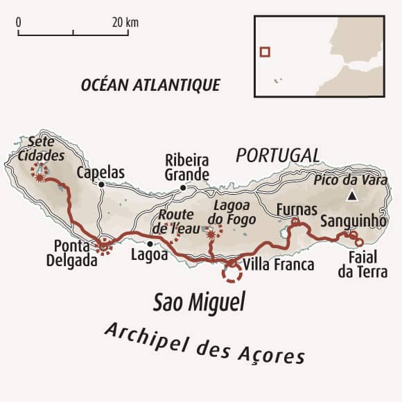 Ce séjour est conçu comme une exploration tranquille, où l’on marche, on goûte et on prend le temps d’observer. Il s’adresse aux voyageurs qui veulent découvrir les Açores en douceur, en mêlant paysages volcaniques, culture et plaisir. Sur l’île de São Miguel, nous suivons les sentiers jusqu’au cratère de Sete Cidades, entre lacs et pâturages ouverts sur l’océan. À Ponta Delgada, une balade gourmande révèle les saveurs locales avant une pause dans les jardins de la ville. Plus loin, la vallée de Furnas offre un temps de relâchement dans les sources chaudes au cœur des montagnes. Nous alternons randonnées faciles, flâneries urbaines et instants de détente, en séjournant à Ponta Delgada puis à Vila Franca do Campo, face à l’Atlantique. Une semaine équilibrée pour ressentir le rythme insulaire et s’imprégner de l’âme açorienne.