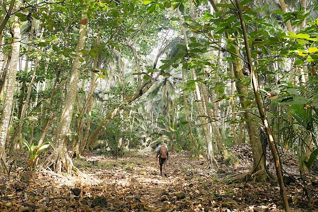 Petite marche jusqu'au promontoire symbolisant la ligne de l'équateur et balade dans la partie la plus sauvage de l'îlot puis installation pour un déjeuner sur la plage.