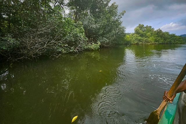 La matinée débute par une paisible navigation en pirogue traditionnelle, guidée par les pêcheurs de la région, à travers les méandres enchanteurs de la mangrove de Malanza. Classée zone protégée, cette mangrove constitue un écosystème d’une richesse exceptionnelle : véritable sanctuaire écologique, elle abrite de nombreuses espèces marines en reproduction, ainsi qu’une avifaune variée. Avec un peu de chance, vous apercevrez les curieux cercopithèques mona – ces singes endémiques – sautant de branche en branche dans leur habitat naturel. La balade se prolonge jusqu’à la sauvage Praia Jalé, où un déjeuner simple mais savoureux vous attend, les pieds dans le sable. Retour en marchant en début d’après-midi à Praia Vanhã, où vous pourrez profiter d’un temps libre pour vous détendre ou explorer à votre rythme. Dîner et nuit à l’éco-bungalow.