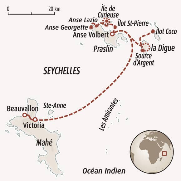 Ce circuit découverte adopte un rythme idéal pour initier vos enfants au voyage de manière ludique. Un circuit de 11 jours aux Seychelles avec généralement vol de nuit à l'aller et au retour pour le confort de la famille (environ 9-10h de vol avec escale d'environ 2 à 4h). Cet itinéraire a été conçu autour de 3 hébergements pour garantir des journées confortables entre temps libres et activités pour les enfants. Le fait de rester 3 nuits consécutives dans 2 hébergements permet de véritablement poser ses bagages et profiter pleinement de chacune des îles. Le départ pour les activités se fait vers 9h pour profiter de la matinée et la fraîcheur du climat, et le retour à l’hôtel vers 15/16h pour profiter de la mer ou la piscine en fin de journée.