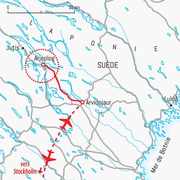 Vol depuis Paris. Accueil à l'aéroport d'Arvidsjaur via Stockholm.Transfert en minibus vers Arjeplog environ (1h15, 90 km), puis à votre hébergement, situé à 2 kilomètres du village. Prenez possession de votre chalet pour la semaine. Nous prenons notre premier repas ensemble au restaurant et profitons de ce moment pour faire le point sur le déroulement de votre séjour.