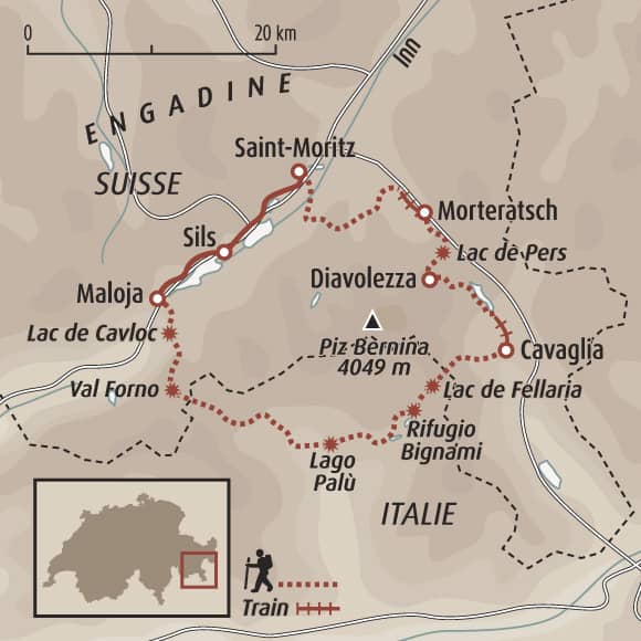 Nous partons à la découverte du massif de la Bernina, entre Grisons suisses et Lombardie italienne. Ce voyage s'adresse à des randonneurs à la recherche d'un trek soutenu, varié et bien rythmé. Pendant six jours, nous marchons sur des itinéraires d'altitude qui enchaînent glaciers, lacs aux couleurs franches, forêts de mélèzes et vallées suspendues. Le piz Bernina, seul sommet de plus de 4000 mètres des Alpes orientales, structure l'ensemble du parcours et accompagne chaque étape. Nous alternons entre terrains minéraux et passages plus doux, versants italiens ensoleillés et grands espaces suisses. Une traversée complète, exigeant et équilibrée, qui combine effort, diversité des paysages et esprit de groupe.