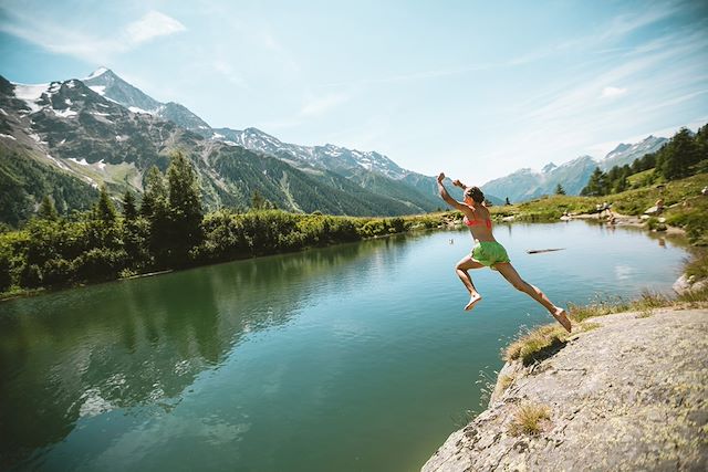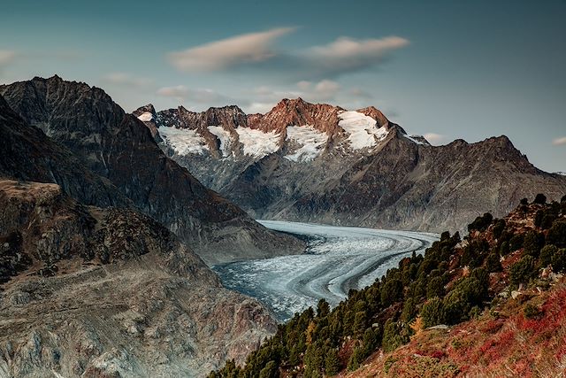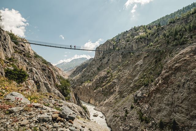 Dans la splendide région de la Jungfrau-Aletsch, inscrite au patrimoine mondial de l’Unesco, 23 kilomètres de glace s’étendent de la Jungfrau jusqu'au front glaciaire, 2500m plus bas, et font du glacier d’Aletsch l'une des merveilles naturelles des Alpes. Les glaces éternelles ne constituent qu’une fraction des splendeurs qui vous attendent. Vous traverserez des ponts suspendus, visiterez la réserve naturelle de la forêt d’Aletsch et dormirez dans des auberges de montagne au cœur des sommets valaisans. Un parcours incontournable et 100% suisse !