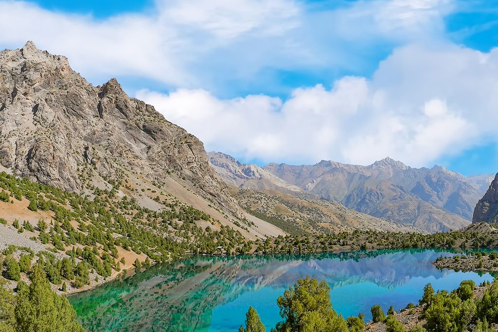Notre itinéraire nous fait découvrir deux facettes bien distinctes de l'Asie centrale, les hautes montagnes du Tadjikistan et les cités emblématiques de l’Ouzbékistan. Nous traversons tout d’abord les monts Fanskye, un massif formé de sommets élancés culminant à plus de 5000m, où nous rencontrons les bergers tadjiks qui viennent faire paître leurs troupeaux. Canyons arides, prairies, forêts de conifères, enfilades de glaciers étincelants forment un paysage varié d’une grande beauté. Les sommets entourant les lacs se reflètent dans leurs eaux cristallines, dans un dégradé de bleu foncé, turquoise et émeraude.