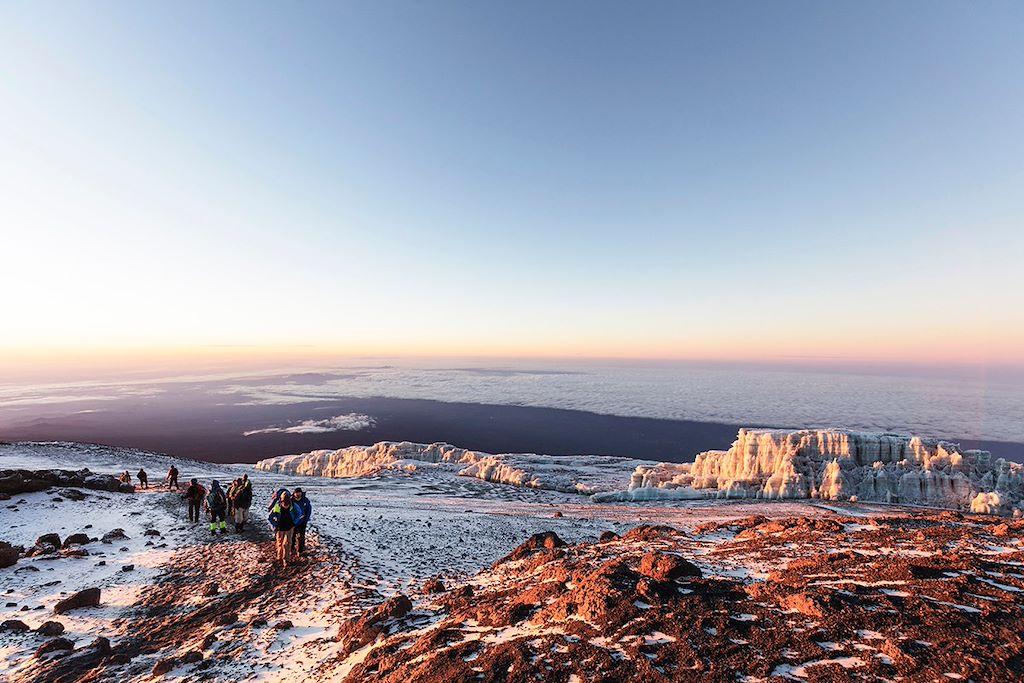 Départ vers 23h30. Température froide, entre -10° et -15°C (attention la température peut passer, par exemple, de -7° à -20°C en quelques secondes à cause de vent très froid). Nous serpentons sur les pentes jusqu’au pied des glaciers Ratzel et Rebman, entre lesquels nous nous engageons. La pente est raide, l’ambiance irréelle au milieu de ces glaciers suspendus. Après 6h de marche, aux premières lueurs de l’aube, nous débouchons sur le bord du cratère à Stella Point. Il faut encore 30mn à une heure de marche sur la crête, généralement enneigée, du volcan pour atteindre le sommet, Uhuru Peak (5895m).