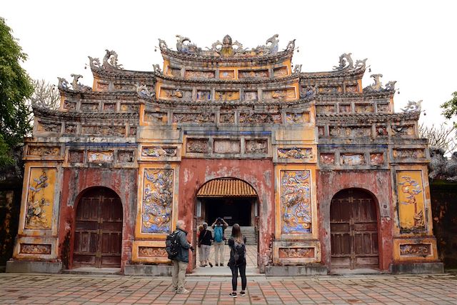 Reprise du véhicule et court trajet (3km) vers le site le plus visité de la ville (qui, à cette heure, devient moins touristique) : la cité impériale, relativement bien conservée compte tenu des affres de la guerre. La cité fut construite sur l’initiative de Gia Long, fondateur de la dynastie des Nguyen qui décida, en 1802, de déplacer la capitale de Hanoi à Hué. Passage devant différents monuments, témoins silencieux d’une période glorieuse dans l’histoire vietnamienne.