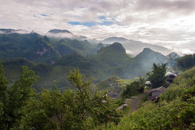 Transfert pour le massif de Can Ty : nous entrons dans le Geoparc de Dong Van, superbe massif calcaire ; randonnée engagée via des villages perchés dans des vallées d'altitude.
