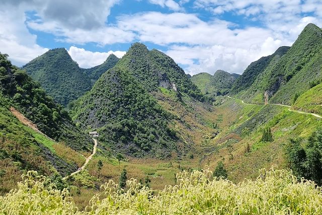 Le matin, transfert routier pour Dong Van. La route entre réellement dans le cœur du géoparc "haut plateau karstique de Dong Van". En chemin, visite de l’ancien palais fortifié de la famille Vuong, dit Palais du roi hmông, témoignage de l’opulence des notables locaux sous la domination française. Nous ferons également un rapide stop à la ville de Dong Van, ancienne capitale d’une principauté hmông et désormais modernisée ; découverte de son marché.